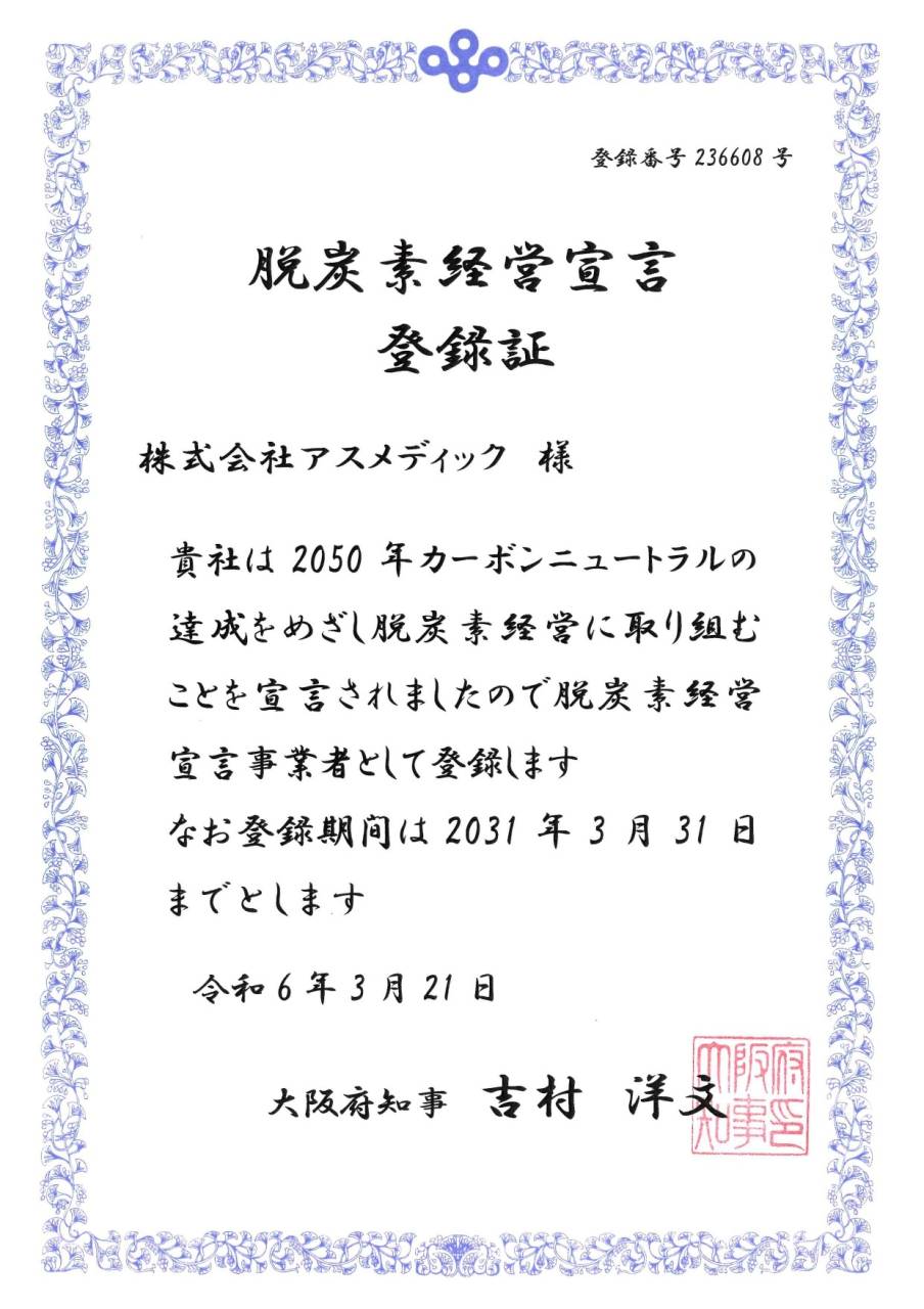 『脱炭素経営』の宣言を行い、2024年3月21日に宣言事業者として大阪府に登録いただきました。