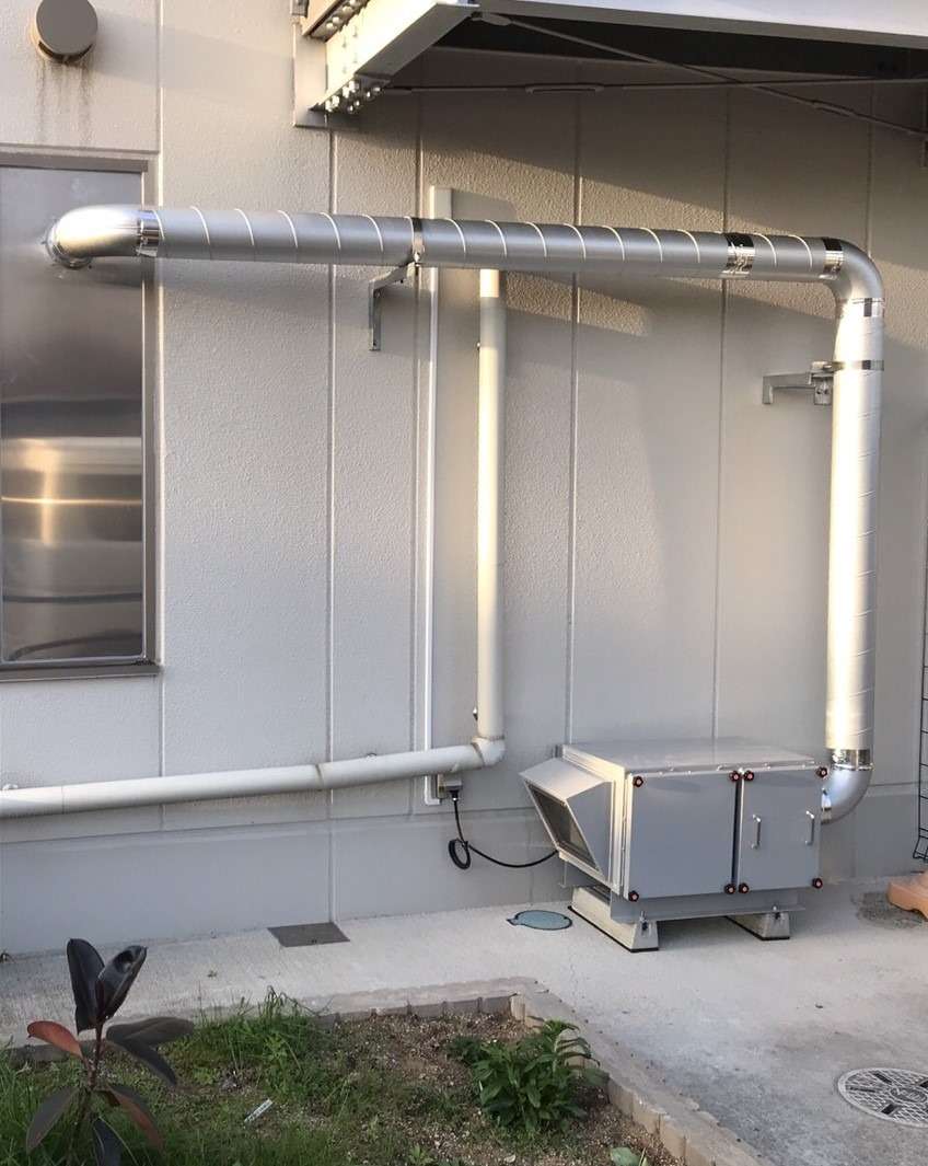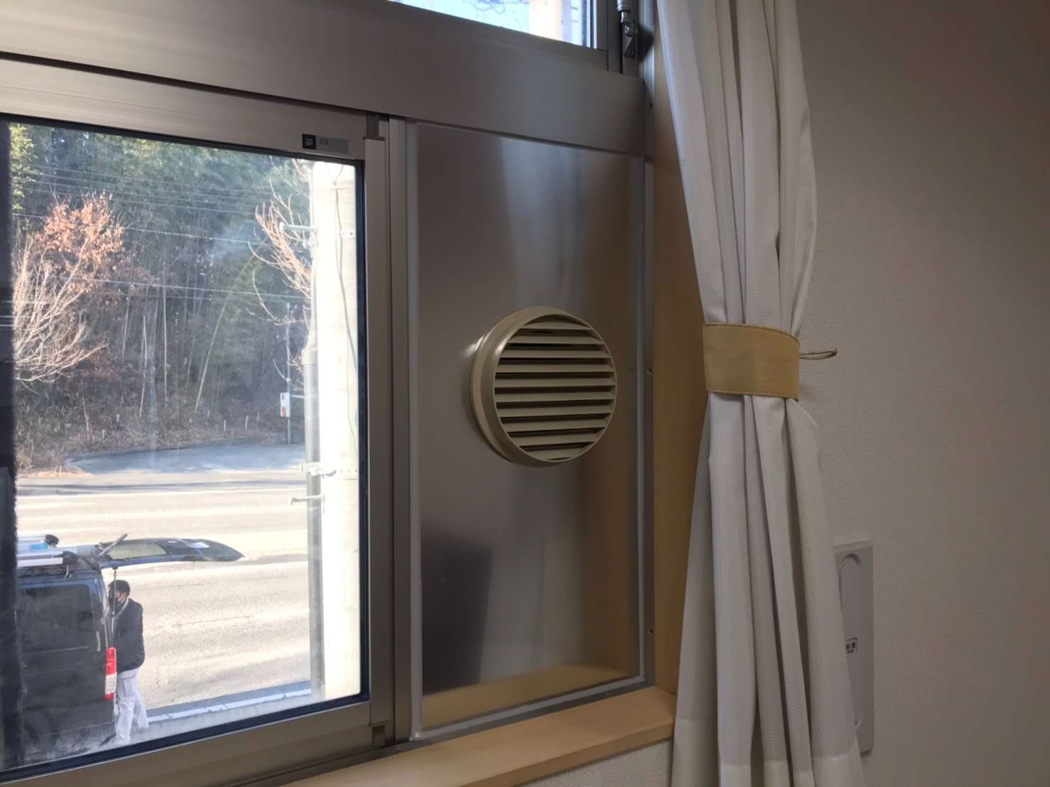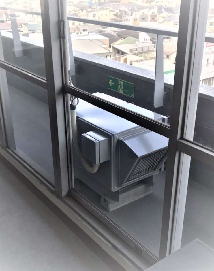窓はめ込み型簡易陰圧装置設置後の外部写真です。