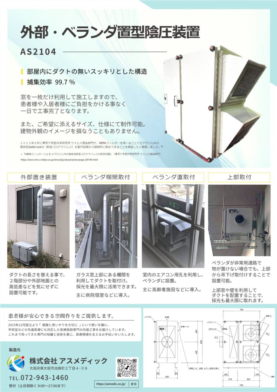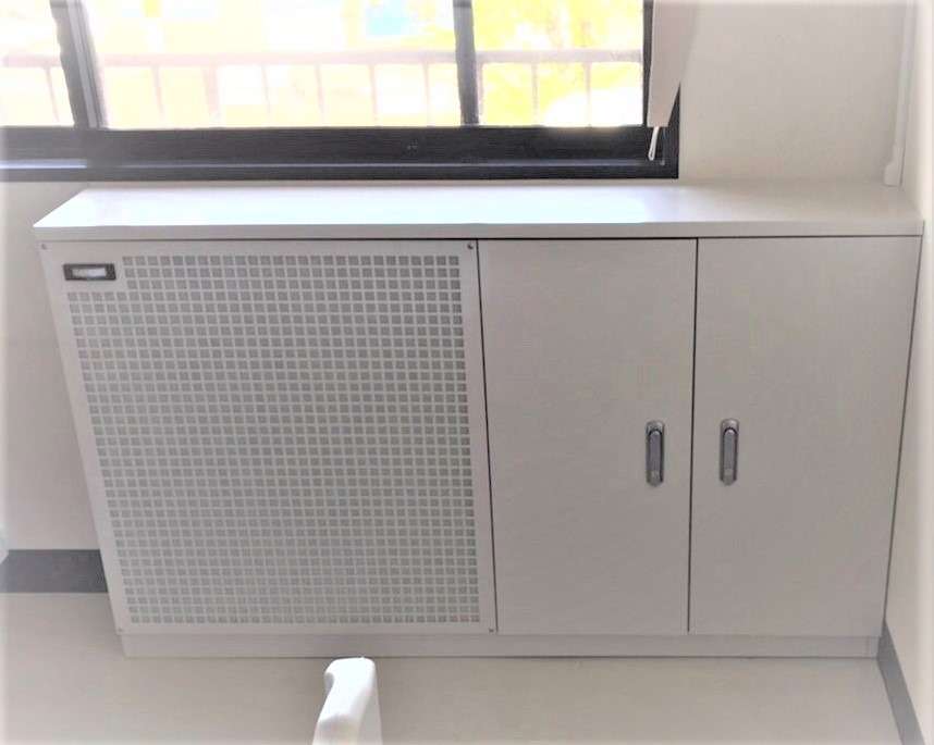 部屋置き家具のように窓下を利用したヨコ型簡易陰圧装置となります。