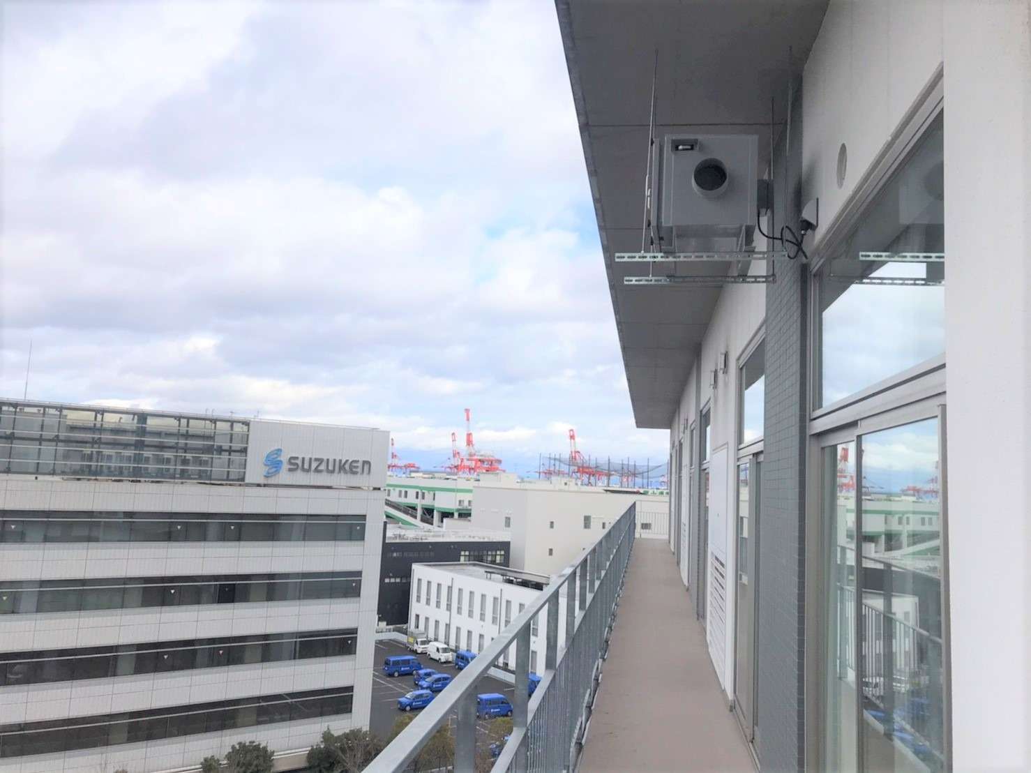 上部に架台を設けて取り付ける事で、非常用通路を邪魔しない仕様となっています。